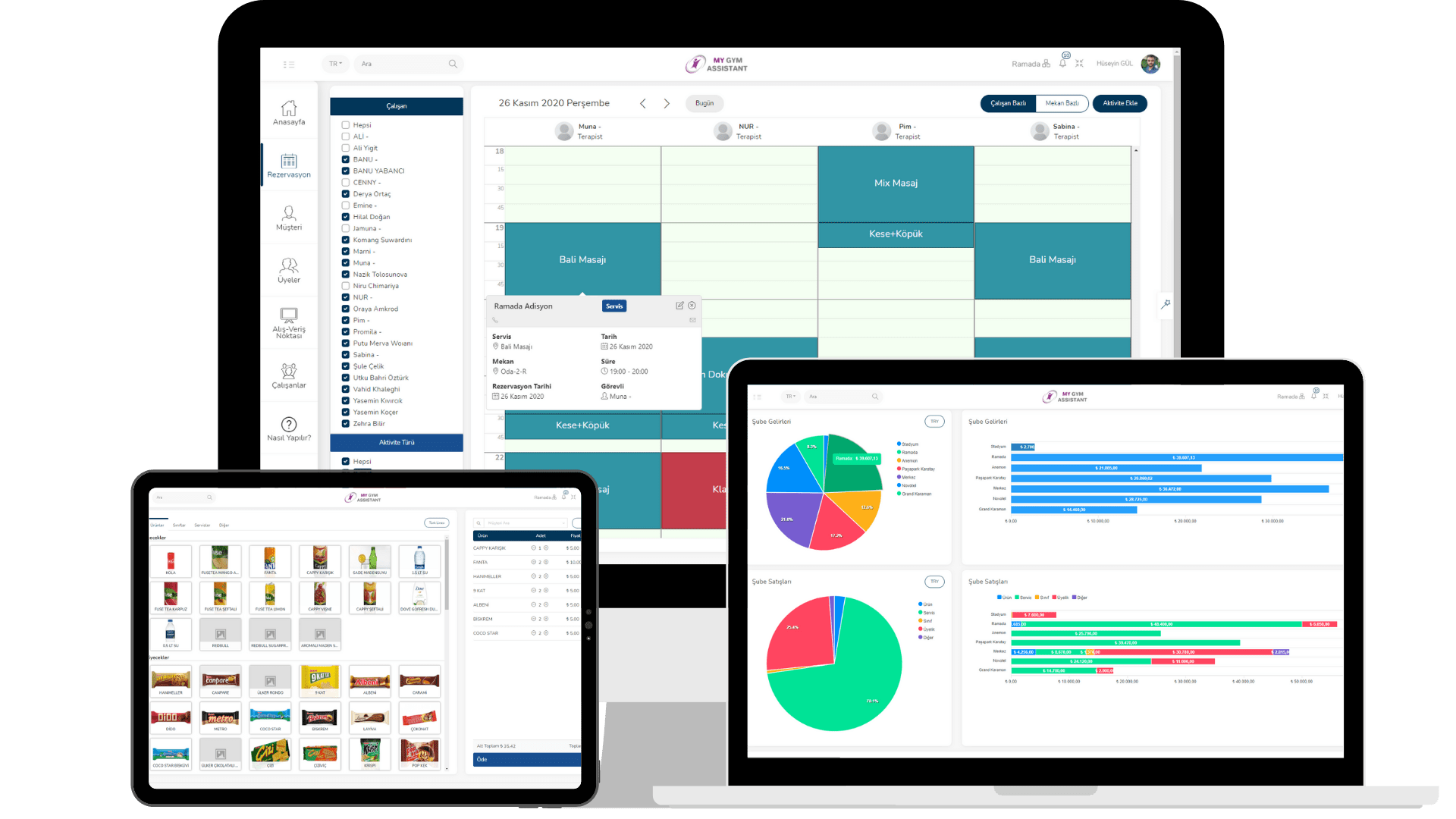 My Gym Assistant, akıllı rezervasyon yönetimi, gelişmiş çalışan ve üye takibi ile butik salonlardan geniş spor komplekslerine kadar tüm işletmelerin ihtiyaçlarını karşılamaktadır.